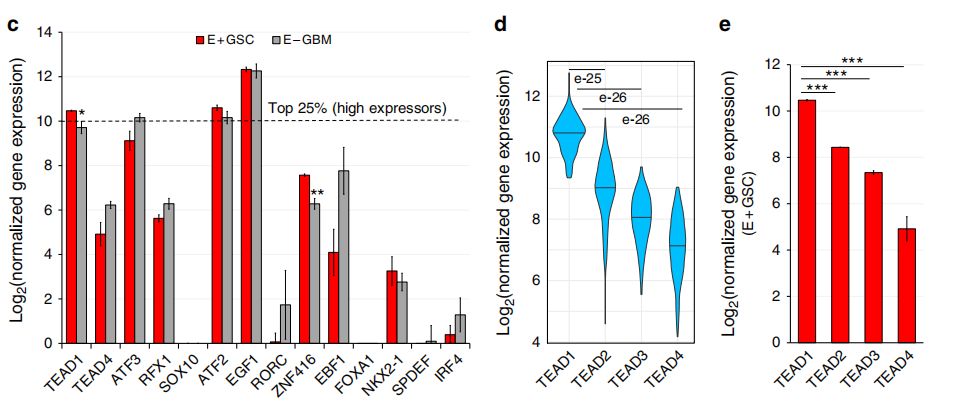 通過ATAC-seq分析染色質(zhì)的可及性,不僅可以識別轉錄的調(diào)控區(qū)域,還可以推斷出其中的TF活性。在此,作者鑒定了27個GSC腫瘤特異性的TF motif,26個在E+GSC和E+NSPC中共有的發(fā)育相關TF motif。其中,TEAD1/4是具有很高活性的TF( motif是GSC特有peak中顯著富集,且基因表達水平高),其它候選TF包括ATF3、RFX1、FOXA1等。而E+GSC和E+NSPC中共有的發(fā)育相關TF包括SOX1、IRF3、NFIA等。然后,作者利用以前的類似的E+/E-GBM的RNA-seq數(shù)據(jù),考慮到腫瘤特異性TF的基因表達水平,其中只有TEAD1在E+GSC中差異過表達。