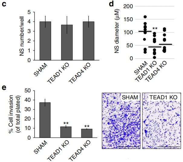 作者通過ATAC-seq繪制了膠質(zhì)母細胞瘤干細胞(GSC)和神經(jīng)干細胞(NSPC)的全基因組染色質(zhì)開放區(qū)域圖譜,并結合轉錄組測序數(shù)據(jù)發(fā)現(xiàn)了在腫瘤細胞遷移中起關鍵作用的轉錄因子TEAD1,并通過細胞和異種移植模型水平上的TEAD1的敲除與過表達的體內(nèi)外功能驗證實驗,驗證了TEAD1促進遷移的功能性作用。