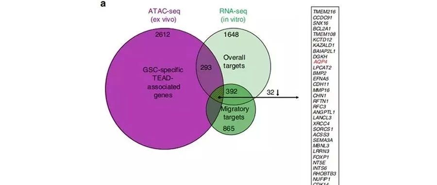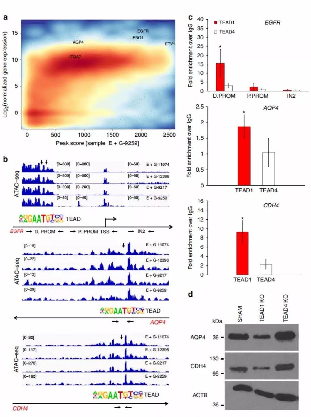 GSC中TEAD1可接近區(qū)域peak(ATAC-seq)和基因表達水平(RNA-seq)的一致性分析,結合GBM中TEAD1與基因共表達(TCGA中的GBM RNA-seq數(shù)據(jù))分析,發(fā)現(xiàn)TEAD1的靶基因包括EGFR、AQP4、CDH4、TNC等多個候選靶基因。
