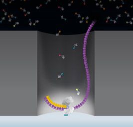PB的測序空間為ZMW(zero-mode wave guides,零模波導孔),外徑100多納米,DNA分子掉入孔中,不同熒光標記的脫氧核苷酸在聚合酶的作用下,會產(chǎn)生不同的熒光信號,隨后標記基團自動脫落,維持了信號的持續(xù)監(jiān)測。激光從ZMW底部打入,由于孔直徑很小而不能穿過孔進入上方溶液區(qū),從而把背景噪音降到最低。
