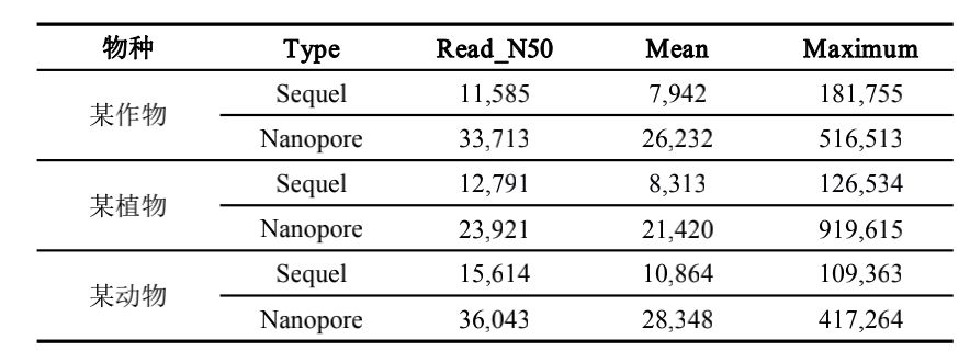 數(shù)據(jù)讀長比較,后3列依次是Read_N50,平均長度和最長reads大小,單位都是bp哦。。。。