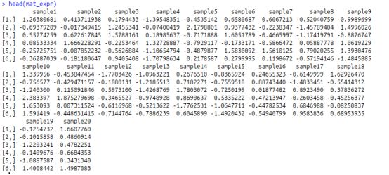 #矩陣,其中行對應(yīng)于與DMR相關(guān)的基因(即與DMR最近的基因,也可以叫做DMR關(guān)聯(lián)基因),矩陣中的值是每個樣品中每個基因的表達(dá)水平(對樣品中的每個基因的表達(dá)進(jìn)行了標(biāo)準(zhǔn)化)。