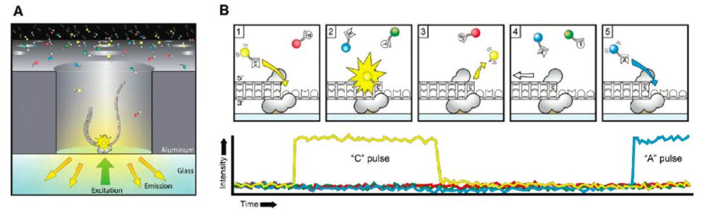 PacBio 提供的是一種邊合成邊測(cè)序的單分子實(shí)時(shí)測(cè)序技術(shù)。測(cè)序時(shí),DNA聚合酶與模板鏈結(jié)合,在鏈合成的過程中,不同熒光標(biāo)記的堿基會(huì)釋放不同的熒光信號(hào),根據(jù)光的波長(zhǎng)與峰值從而判斷堿基類型與順序。