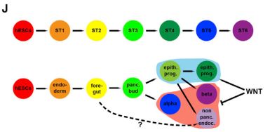 體外分化方法的最終目標(biāo)是為糖尿病患者提供源自多能干細(xì)胞的β細(xì)胞而不是移植胰島。然而,應(yīng)該注意到,目前實(shí)施的醫(yī)療方案涉及全胰島移植,而不是單獨(dú)的β細(xì)胞。事實(shí)上,移植單細(xì)胞類型無法確定是否能夠重新獲得整個胰島的功能。因此,致力于在體外產(chǎn)生完整的胰島比純粹的β細(xì)胞群更有意義。文章嘗試在體外單細(xì)胞水平產(chǎn)生胰腺內(nèi)分泌細(xì)胞的方法。作者通過scRNA-seq產(chǎn)生了一個無偏的大數(shù)據(jù)集,這使得能夠表征所產(chǎn)生的各種細(xì)胞類型,它們的分化時間以及鑒定影響細(xì)胞命運(yùn)的分子途徑。長遠(yuǎn)來看,精細(xì)調(diào)整祖細(xì)胞與內(nèi)分泌命運(yùn)的時間和平衡的能力可用于控制α和β細(xì)胞之間的比例,并促進(jìn)具有適當(dāng)細(xì)胞組成的胰島的體外形成。