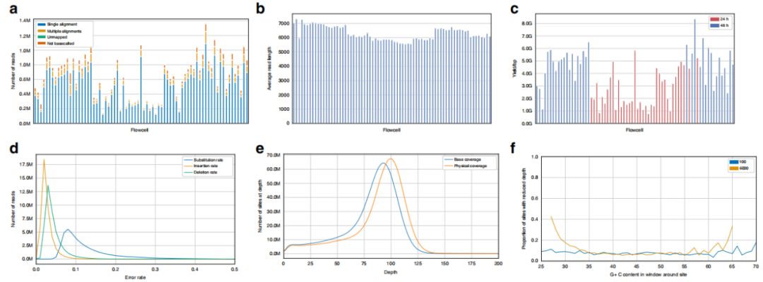 GM12878人B淋巴細胞采用PCR擴增和6kb片段篩選的文庫制備方案,共計獲得45,740,123條reads(圖1a),平均讀取長度為6373bp(圖1b)在流動細胞中是一致的,并且基于測序文庫的物理大小選擇非常接近預期。總數(shù)據(jù)量為273.4Gb,每個flow cell的平均產(chǎn)量為3.7Gb(圖1c)??傆?2,924,782個高質(zhì)量clean reads的比對率為99.3%,唯一比對率為88.8%。