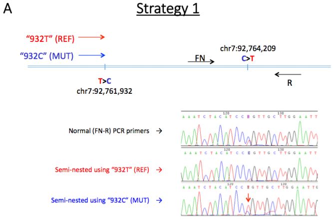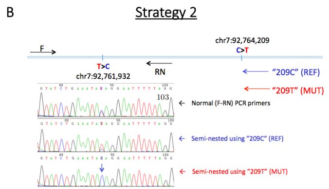 不出所料,ONT數(shù)據(jù)也鑒定到了具有預期雜合基因型的c.1076 G> A和c.3353 A> G變異。使用ONT reads對其他附近變異進行定相,以確認新生變異的遺傳和來源(圖3)。這2個新生突變被定相于一個199kb的block內(nèi),33條reads(6.1-18.9kb)跨越2個新生突變位點,11條reads包含新生突變等位基因,8條reads包含2個參考等位基因,表明突變的等位基因是順式的(來自于同一條染色體)。(NA12878數(shù)據(jù)中沒有reads跨越包含2個位點的突變等位基因。)使用一系列等位基因特異性PCR實驗證實來自ONT reads的新生等位基因的單倍型構(gòu)象。相位區(qū)中的側(cè)翼位點表明,父系遺傳的單倍型出現(xiàn)了新生變異(圖3)。
