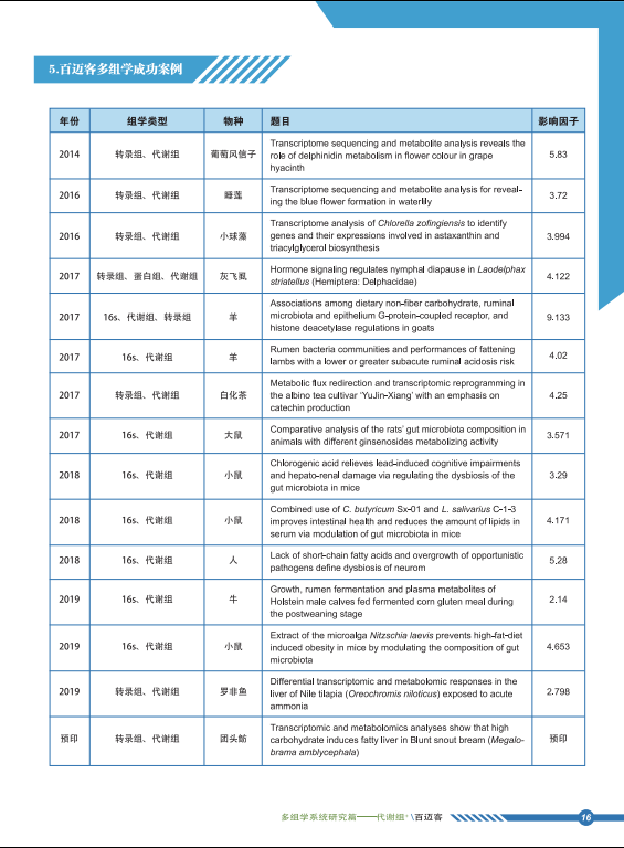百邁客致力于將好的技術(shù)提供給科研者。代謝組服務(wù)現(xiàn)已細(xì)分服務(wù)內(nèi)容,涉及非靶向代謝組,脂質(zhì)非靶向代謝組,靶標(biāo)代謝組,植物高通量靶標(biāo),動物高通量靶標(biāo),花青素高通量靶標(biāo),游離脂肪酸高通量靶標(biāo),氨基酸高通量靶標(biāo)等。目前,百邁客已經(jīng)協(xié)助發(fā)表大量多組學(xué)聯(lián)合文章,涉及到轉(zhuǎn)錄組 & 代謝組、微生物多樣性 & 代謝組,轉(zhuǎn)錄組 & 微生物多樣性 & 代謝組。點擊這里下載“百邁客生物代謝組成功案例>>百邁客生物代謝組成功案例