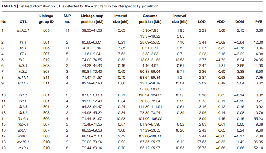 FD定位到4個QTL,分別位于LG3與11上,QTL貢獻(xiàn)率分別為fd3.1(11.98%)、fd3.2 (8.50%)、fd11.1 (7.95%)與fd11.2 (6.62%)。每個QTL的遺傳距離為0.15-0.68 cM.;fl12.1與fd3.2存在部分重疊,fd11.1與fd11.2分別跨越Chr11:71.47-71.87 cM and 82.29-82.98 cM。并且每個QTL包含的SNP數(shù)目為2-4個。