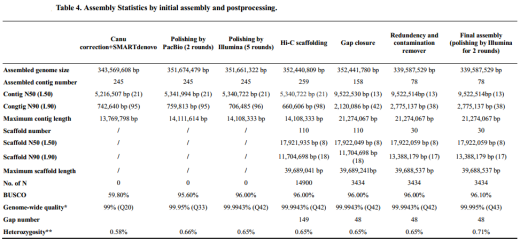 在小墊柳(Cushion willow)基因組組裝中,首先利用SMARTdenovo對糾錯后的74xONT數(shù)據(jù)進(jìn)行組裝,然后分別利用125xPacBio數(shù)據(jù)(two rounds )與Illumina數(shù)據(jù)(five rounds )進(jìn)行polish,基因組完整性評估后,利用Hi-C將Contig掛載到染色體水平,最終組裝獲得小墊柳基因組大小339.588 Mb,Contig N50=9.522 Mb。?(Table 4)