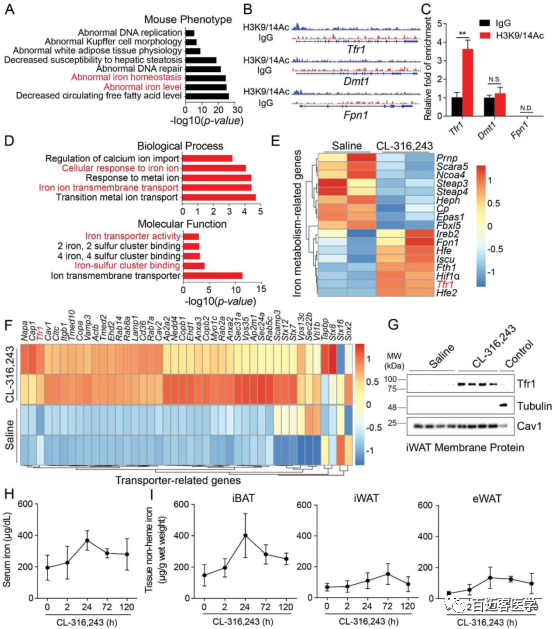 本研究首先利用Chip-seq (Fig 1A/B)、RNA-seq(Fig 1D/E)、蛋白組三種技術(shù)手段,從轉(zhuǎn)錄調(diào)控、mRNA、蛋白質(zhì)三個(gè)不同層面發(fā)現(xiàn)在實(shí)驗(yàn)組(C57BL/6J mice)中與鐵轉(zhuǎn)運(yùn)相關(guān)的啟動(dòng)子 、基因、蛋白均有明顯的富集。為了驗(yàn)證結(jié)果的準(zhǔn)確性,對(duì)與鐵轉(zhuǎn)運(yùn)相關(guān)的啟動(dòng)子進(jìn)行用Chip-qPCR(Fig 1C)的方法驗(yàn)證,對(duì)鐵轉(zhuǎn)運(yùn)相關(guān)的蛋白做了WB驗(yàn)證(Fig 1G),結(jié)果都顯示Tfr1基因在實(shí)驗(yàn)組(C57BL/6J mice)中的表達(dá)量明顯增加。綜上所述,Tfr1基因在CL-316,243處理的小鼠中Tfr1基因?qū)﹁F穩(wěn)態(tài)起著至關(guān)重要的作用。