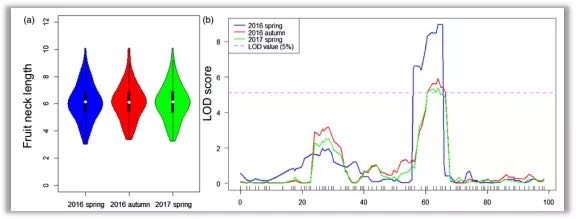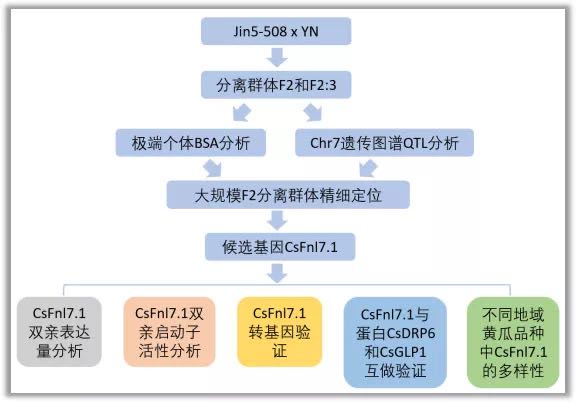 本研究首先通過(guò)長(zhǎng)果把品種Jin5-508和短把品種YN雜交構(gòu)建的性狀分離群體(F2和F2:3),從F2中選擇果把長(zhǎng)度極端個(gè)體構(gòu)建DNA混池進(jìn)行高通量測(cè)序,BSA分析和傳統(tǒng)遺傳圖譜共同在7號(hào)染色體上定位到一個(gè)主效QTL。再通過(guò)分離群體精細(xì)定位、基因表達(dá)分析、轉(zhuǎn)基因驗(yàn)證等方法確定了調(diào)控果把長(zhǎng)度基因CsFnl7.1。同時(shí)發(fā)現(xiàn)CsFnl7.1啟動(dòng)子區(qū)域的多態(tài)性調(diào)控CsFnl7.1的表達(dá)水平。結(jié)合自然群體材料的多樣性分析,發(fā)現(xiàn)CsFnl7.1位點(diǎn)可能起源于印度。