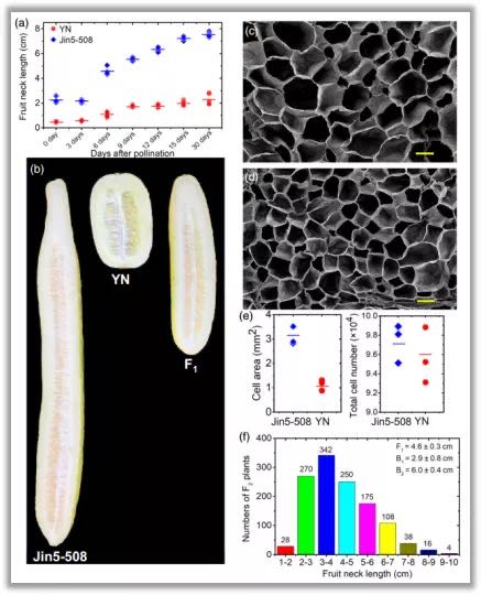 授粉30天后,雙親Jin5-508和YN黃瓜果把長(zhǎng)度不再增長(zhǎng),于是選擇該時(shí)間節(jié)點(diǎn)作為果把長(zhǎng)度鑒定的時(shí)期(圖1a)。Jin5-508果把長(zhǎng)度顯著長(zhǎng)于YN,這種差異是因?yàn)镴in5-508果把果肉細(xì)胞體積大于YN,而非細(xì)胞數(shù)增多(圖1b,c,d,e)。統(tǒng)計(jì)F1群體、回交群體和F2群體果把長(zhǎng)度發(fā)現(xiàn),F(xiàn)1群體表現(xiàn)出中親表型,而回交群體表型更偏向于輪回親本,F(xiàn)2群體表現(xiàn)出連續(xù)的近正態(tài)分布(圖1f),以上結(jié)果表明黃瓜果把長(zhǎng)度是數(shù)量性狀。