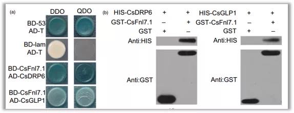 利用酵母雙雜技術(shù),以CsFnl7.1蛋白為誘餌篩選與其互做的蛋白,結(jié)果顯示共得到53個(gè)陽(yáng)性克隆,在這些蛋白中有多個(gè)與細(xì)胞伸展相關(guān),包括CsDRP6和CsGLP1(圖8a)。體外pull down實(shí)驗(yàn)顯示,融合蛋白HIS-CsDRP6和HIS-CsGLP1可以被GST-CsFnl7.1高效捕獲,而對(duì)照GST則不能(圖8b)。以上結(jié)果充分說(shuō)明CsFnl7.1與CsDRP6、CsGLP1之間存在互做關(guān)系。