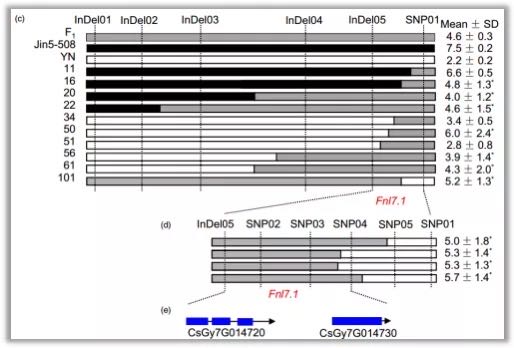 為驗(yàn)證BSA的定位結(jié)果,作者在3個(gè)不同環(huán)境下調(diào)查了102個(gè)F2:3家系(Jin5-508 ×?YN)的表型,結(jié)果顯示F2:3表型也符合正態(tài)分布(圖3a)?;陔p親重測(cè)序數(shù)據(jù),作者在7號(hào)染色體上開(kāi)發(fā)了72個(gè)雙親多態(tài)標(biāo)記(SNP和InDel),用這些標(biāo)記合F2群體構(gòu)建7號(hào)染色體的連鎖圖譜。結(jié)合F2:3群體3個(gè)環(huán)境的表型以及F2遺傳圖譜,共同定位到了1個(gè)主效QTL(圖3b),表型貢獻(xiàn)率在27.9%-32.7%。綜合BSA定位和遺傳圖譜定位結(jié)果,最終吧QTL Fnl7.1定位在7號(hào)染色體上2.85Mb的區(qū)間內(nèi)。