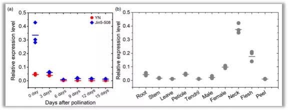 選擇雙親授粉后0-15天幼瓜進(jìn)行CsFnl7.1的表達(dá)量分析,qRT-PCR結(jié)果顯示授粉后6個(gè)時(shí)間點(diǎn),CsFnl7.1在雙親中表達(dá)差異不顯著,而且表達(dá)量表現(xiàn)出持續(xù)降低(圖5a)。但是,在授粉當(dāng)天,CsFnl7.1在Jin5-508中表達(dá)量顯著高于YN。組織特異表達(dá)分析顯示,CsFnl7.1在果把中表達(dá)量最高(圖5b)。?