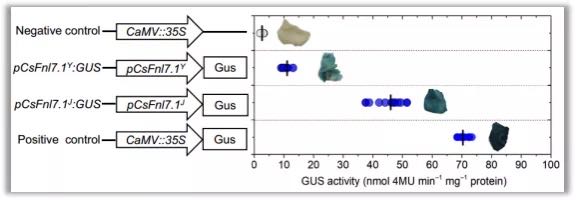 序列分析顯示,雙親CsFnl7.1啟動(dòng)子區(qū)存在多處序列差異(25個(gè)SNPs和7個(gè)InDels),因此作者將雙親的啟動(dòng)子進(jìn)行了克隆,分別與GUS基因構(gòu)建整合質(zhì)粒,轉(zhuǎn)化煙草葉片進(jìn)行啟動(dòng)子活性分析。發(fā)現(xiàn)Jin5-508啟動(dòng)子(pCsLEAJ)活性是YN啟動(dòng)子(pCsLEAY)活性的4倍(圖6)。這與轉(zhuǎn)錄組分析結(jié)果一致(授粉當(dāng)天CsFnl7.1在Jin5-508表達(dá)量顯著高于YN),從而說(shuō)明CsFnl7.1表達(dá)受順式調(diào)控。