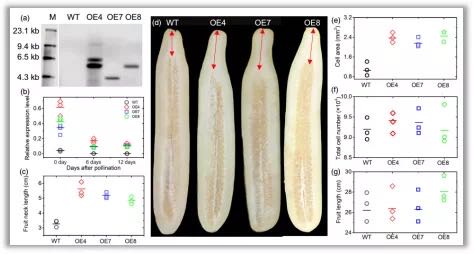 為進(jìn)一步驗(yàn)證基因功能,作者將CsFnl7.1轉(zhuǎn)入短把品種“D8”中,得到3個(gè)T2代單株(OE4、OE7和OE8)。Southern雜交顯示OE4、OE7和OE8分別插入1、1和2個(gè)拷貝(圖7a)。與對(duì)照相比,3個(gè)轉(zhuǎn)基因個(gè)體CsFnl7.1表達(dá)量顯著提高,同時(shí)果把長(zhǎng)度也更長(zhǎng),說(shuō)明CsFnl7.1確實(shí)能夠影響果把長(zhǎng)度(圖7b,c,d)。分析果把果肉細(xì)胞的個(gè)數(shù)和大小發(fā)現(xiàn),轉(zhuǎn)基因個(gè)體比對(duì)照個(gè)體細(xì)胞更大,但細(xì)胞數(shù)在兩者之間沒(méi)有顯著差異(圖7e,f,g),從而說(shuō)明CsFnl7.1是通過(guò)調(diào)控細(xì)胞伸展來(lái)影響果把長(zhǎng)度。