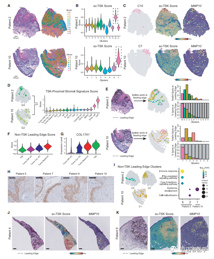 在患者中,腫瘤相關(guān)的斑點簇展現(xiàn)出單細胞測序腫瘤KCs的定位基因表達,同時免疫或間質(zhì)基因與腫瘤臨近間質(zhì)、未受累的間質(zhì)或附件區(qū)域有關(guān)聯(lián),與大體的cSCC結(jié)構(gòu)一致(圖3A)。使用scRNA-seq中TSK標記基因?qū)γ總€空間轉(zhuǎn)錄組斑點評分,顯著突出了一個TSK-high簇,包括TSK標記物MMP10(圖3B&C)。在具有清晰前沿的腫瘤中,TSK鄰近間質(zhì)富集了癌癥相關(guān)成纖維細胞 (CAF)和內(nèi)皮細胞轉(zhuǎn)錄本,表明TSK細胞主要位于纖維血管微環(huán)境中(圖3D)。超過80%的TSK高簇點位于腫瘤前沿,其余的前沿點富集了Basal腫瘤基因(圖3E&F),這種共存關(guān)系通過共表達標志物COL17A1的免疫組化得到進一步確認(圖3G&H)。此外,炎癥反應和干擾素信號基因在非TSK前沿表達,與干擾素相關(guān)轉(zhuǎn)錄本在腫瘤基底群體中的存在一致(圖2E&I)。這些結(jié)果確定了TSK、Basal細胞以及TSK近端纖維血管生態(tài)位造成的cSCC腫瘤前沿的異質(zhì)性。