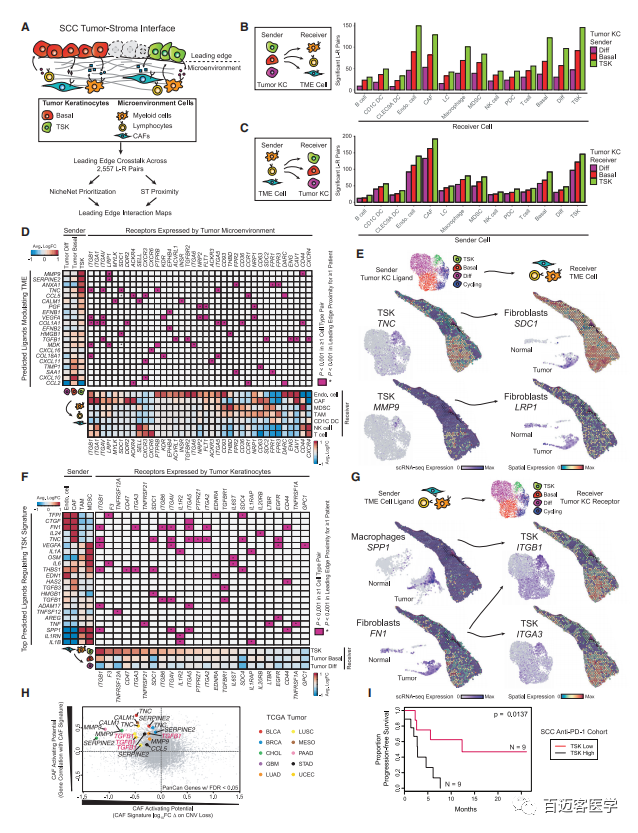 進一步,我們整合scRNA-seq和ST數(shù)據(jù)來描述前沿鄰近腫瘤和TME細胞之間的信號通路(圖6A)?;谂潴w-受體對數(shù)據(jù)庫,TSKs廣參與了自分泌和旁分泌相互作用(主要與CAFs、內(nèi)皮細胞、巨噬細胞和MDSCs)(圖6B&C)。我們使用NicheNet和ST對前沿預測為調(diào)節(jié)TME特異性細胞類型標記的腫瘤KC配體進行優(yōu)先排序。與TSK-纖維血管生態(tài)位一致的是,對CAFs的顯著TSK信號通路是由幾對TSK-CAF配體-受體對介導的,包括MMP9-LRP1和TNC-SDC1(圖6D&E)。此外,TSKs可通過配體-受體對(PGF-FLT1、PGF-NRP2和EFNB1-EPHB4)調(diào)節(jié)內(nèi)皮細胞。相反地,內(nèi)皮細胞和CAFs顯著共表達NicheNet預測配體,如TFPI, FN1,和THBS1,這些與TSK受體匹配(圖6F&G)。進一步證實TSKs是一種類似EMT的群體。為了判定TSK細胞是否與多變的TME普遍關(guān)聯(lián),我們調(diào)研了TCGA數(shù)據(jù)庫中31種實體瘤數(shù)千個轉(zhuǎn)錄組數(shù)據(jù)。我們進一步判定TSK配體是否誘導CAF基因(1)伴隨配體CNV缺失,減少CAF基因表達;(2)配體表達和CAF基因的關(guān)聯(lián)(圖6H),這個在過往研究中被證實。另外TSK細胞可以抑制抗腫瘤免疫。雖然這些研究還不明確TSK細胞是內(nèi)在抵抗還是免疫調(diào)節(jié)活性起作用,但這個亞群提供了一個提高免疫治療的目標方向。