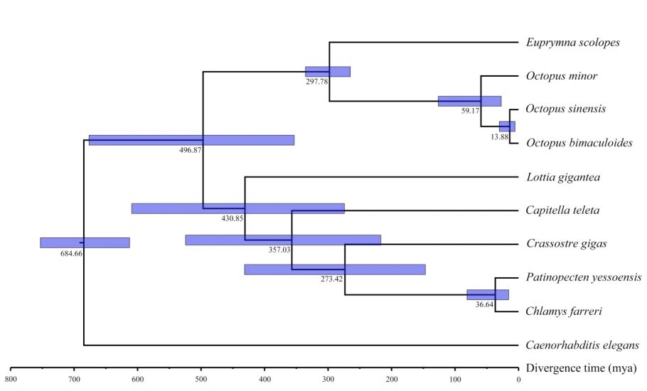 比較基因組學(xué)分析發(fā)現(xiàn)預(yù)測到的31676個(gè)基因中有24698個(gè)基因可被聚類到17020個(gè)基因家族。其中有741個(gè)基因家族為10個(gè)物種共有,包含有10653個(gè)同源基因。利用10個(gè)物種的238個(gè)單拷貝同源基因構(gòu)建進(jìn)化樹,結(jié)果表明長蛸的分化時(shí)間早于中國真蛸和加州雙斑蛸,而中國真蛸與加州雙斑蛸關(guān)系更近,其分化時(shí)間約為13.88 Mya(圖3)。