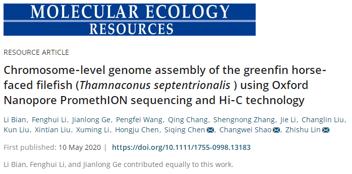 2020年5月,中國水產(chǎn)科學(xué)研究院黃海水產(chǎn)研究所陳四清研究員團(tuán)隊(duì)與北京百邁客生物科技有限公司合作完成了超高質(zhì)量的綠鰭馬面鲀基因組,相關(guān)研究成果發(fā)表在知名期刊Molecular Ecology Resources上。本次研究基于納米孔測序技術(shù)(Nanopore)和染色體構(gòu)象捕獲技術(shù)(Hi-C)完成的基因組僅包含242個(gè)Contigs,Contig N50高達(dá)22.46 Mb,并將99.44%序列掛載到20條染色體上,實(shí)現(xiàn)了海洋魚類基因組組裝質(zhì)量質(zhì)的飛躍。