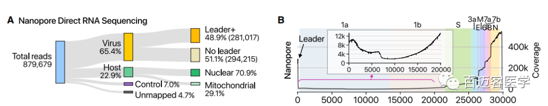 這篇文章結(jié)合了兩種測序方法,Direct RNA sequencing (DRS)和sequencing-by-synthesis (SBS),明確地繪制了SARS-CoV-2的亞基因組RNA(subgenomic RNAs),ORF和轉(zhuǎn)錄調(diào)控序列(TRS)。同時(shí)發(fā)現(xiàn)了許多與常規(guī)TRS介導(dǎo)的聚合酶跳躍不同的非常規(guī)RNA融合事件。發(fā)現(xiàn)了RNA修飾位點(diǎn),并測量了gRNA和sgRNA的poly(A)的長度。