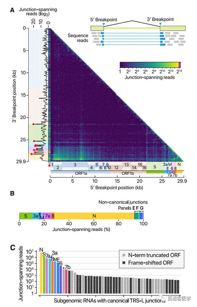 用DNB-seq確認(rèn)和檢查CoV基因組的junctions。在junctions處繪制了5’和3’斷點(diǎn),并通過計(jì)算跨越j(luò)unctions的reads來估算融合頻率(圖2A)。如所預(yù)期的,leader代表了最突出的5’ 位點(diǎn)(圖2A,x軸上的紅色星號)。TRS-B被檢測為3’位點(diǎn)的頂端(圖2A,y軸上的紅點(diǎn))。這些結(jié)果證實(shí),SARS CoV-2使用標(biāo)準(zhǔn)的TRS介導(dǎo)的模板轉(zhuǎn)換機(jī)制進(jìn)行不連續(xù)轉(zhuǎn)錄,以產(chǎn)生主要的sgRNA(圖2B)??缭絡(luò)unctions reads的定量比較顯示,N RNA是表達(dá)最豐富的轉(zhuǎn)錄本,其次是S,7a,3a,8,M,E,6和7b(圖2C)。