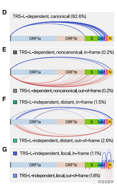 SARS-CoV-2除了具有預(yù)期結(jié)構(gòu)和長度的經(jīng)典sgRNA(圖4D),結(jié)果還顯示出許多次要的junction sites(圖4E–4G)。這種融合事件有三種主要類型。第一組中的RNA在位于ORF或UTR中間非預(yù)期的3’位點(diǎn),前導(dǎo)序列(leader)與下游編碼序列(body)結(jié)合(圖4E,TRS-L-dependent noncanonical)。第二組顯示了與前導(dǎo)序列沒有相似性的序列之間的遠(yuǎn)距離融合(圖4F, TRS-L-independent distant)。最后一組局部融合,這導(dǎo)致較小的缺失,主要發(fā)生在結(jié)構(gòu)基因和輔助基因中,包括S ORF(圖4G,TRS-L-independent local recombination)。