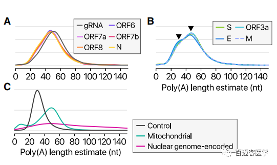由于納米孔DRS基于RNA的單分子檢測,因此它提供了獨(dú)特的機(jī)會來檢查單個(gè)RNA分子的多個(gè)轉(zhuǎn)錄組特征。本文使用自己開發(fā)的軟件根據(jù)DRS數(shù)據(jù)來測量ploy(A)尾的長度(Y. Choi and H.C., unpublished data)。使用此軟件測量發(fā)現(xiàn),與其他CoV一樣,SARS-CoV-2 RNA帶有ploy(A)尾(圖5A–5B)。病毒RNA尾的中位長度為47 nt。全長gRNA的尾巴比sgRNA更長。值得注意的是,sgRNA具有兩個(gè)種群:一個(gè)在30 nt處的小峰和一個(gè)在45nt處的主峰(圖5B,箭頭)。之前研究發(fā)現(xiàn) bovine CoV mRNA的ploy(A)尾長度在感染過程中發(fā)生了變化,在這項(xiàng)研究中觀察到的30 nt的短尾可能代表易于衰變的老化RNA。與宿主核基因組編碼的mRNA不同,病毒RNA具有均勻的長度分布(圖5C)。