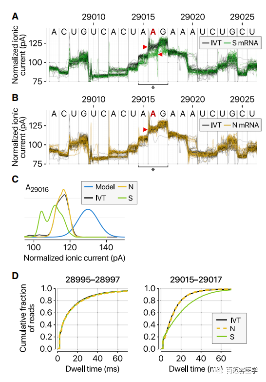 研究人員用DRS數(shù)據(jù)檢測了SARS-CoV-2的表觀轉(zhuǎn)錄組學(xué)。病毒RNA修飾在40多年前就已描述過(Gokhale and Horner,2017)。為了明確研究RNA修飾,作者通過體外轉(zhuǎn)錄病毒序列生成了陰性對照RNA,并對陰性對照進(jìn)行了直接RNA測序。注意到陰性對照和病毒轉(zhuǎn)錄本之間的離子電流之間的差異非常有趣(圖6A)。至少有41個(gè)位點(diǎn)顯示出實(shí)質(zhì)性差異(頻率超過20%),表明存在潛在的RNA修飾位點(diǎn)。值得注意的是,某些位點(diǎn)顯示的頻率取決于sgRNA的種類。圖6A–6C,S RNA上比N RNA修飾的位點(diǎn)更多,與S RNA相比ORF8 RNA上的修飾頻率更高。此外,修飾的堿基(圖6D,右)的停留時(shí)間比未修飾的堿基(圖6D,左)的停留時(shí)間長,表明修飾會干擾RNA分子過孔速度。