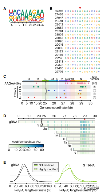 在41個(gè)潛在的修飾位點(diǎn)中,最常見的motif是AAGAA(圖7A和7B)。在整個(gè)病毒基因組中都發(fā)現(xiàn)了“AAGAA-like”motif的修飾位點(diǎn)(包括AAGAA和其他富含A/G的序列),尤其是在基因組28,500-29,500處特別豐富(圖7C)。病毒長的轉(zhuǎn)錄本(gRNA,S,3a,E和M)比短RNA(6、7a,7b,8和N)的修飾頻率更高(圖7D),表明該修飾是特定于某些RNA種類。因?yàn)镈RS可以同時(shí)檢測單個(gè)分子上的多個(gè)特征,所以作者交叉檢測了poly(A)尾長和內(nèi)部修飾位點(diǎn)。有趣的是,修飾的RNA分子的poly(A)尾比未修飾的短(圖7E)。這些結(jié)果表明內(nèi)部修飾和3’尾之間存在聯(lián)系。由于poly(A)尾巴在RNA周轉(zhuǎn)中起重要作用,因此很容易推測所觀察到的內(nèi)部修飾與病毒RNA穩(wěn)定性控制有關(guān)。