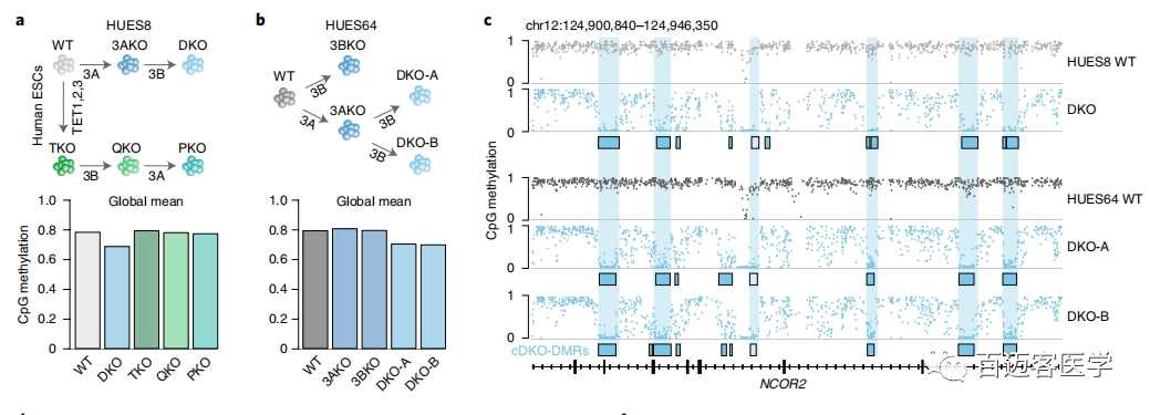 作者對DNMT或TET進(jìn)行全面基因敲除,評估甲基化和去甲基化酶之間的相互作用。采用WT HUES8 ESC,并將Cas9與靶向DNMT3A和DNMT3B的sgRNA結(jié)合使用,獲得缺失所有從頭甲基轉(zhuǎn)移酶活性的HUES8雙敲除(double-knockout,DKO)ESC。并獲得先前生成的TET1-/-、TET2-/-、TET3-/-三敲除(triple-knockout,TKO)ESC以及TKO額外敲除DNMT3B衍生的四敲除(quadruple-knockout,QKO)ESC。然后,進(jìn)一步突變HUES8 QKO中的DNMT3A,以生成DNMT3A-/-、DNMT3B-/-、TET1-/-、TET2-/-、TET3-/-PKO ESC,建立了新的細(xì)胞系( pentuple-knockout)PKO ESC(圖1a,頂部)。所有敲除的細(xì)胞系在形態(tài)上都沒有異常,并表達(dá)了自我更新和多能性相關(guān)基因,這表明在未分化狀態(tài)下不需要DNMT3和TET表達(dá)。通過二代全基因組亞硫酸氫鹽測序(WGBS)來研究這些品系中的全局DNA甲基化模式,在所有樣品中檢測到670萬個匹配的CpG,其覆蓋率≥10x。如預(yù)期的那樣,HUES8 WT顯示出較高的平均CpG甲基化水平(WT,0.78;圖1a,底部)。經(jīng)過6次傳代后,DNMT3無效的ESC中的總體甲基化水平降低了0.09(DKO,0.69),而TET無效的ESC中的總體平均水平僅增加0.01(TKO,0.79)。有趣的是,當(dāng)在無TET的細(xì)胞中敲除從頭甲基轉(zhuǎn)移酶后,在第6代觀察到幾乎沒有變化(QKO,0.78;PKO,0.77)。這些結(jié)果表明,DNMT3缺失后,大部分DNA去甲基化取決于TET活性。