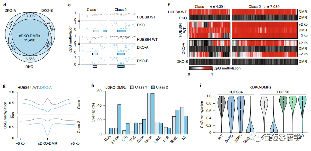 為了進(jìn)一步研究這種甲基化缺失,接下來從另一個人類ESC系(HUES64)(包括2個獨(dú)立的DKO克?。ˋ和B))WT和DKO細(xì)胞進(jìn)行了甲基化測序,并將甲基化水平與先前衍生的18個單DNMT3A-/-(3AKO)和單DNMT3B-/-(3BKO)敲除數(shù)據(jù)作比較(圖1b)。兩種不同的雄性WT ESC似乎具有可比性,具有相似的整體甲基化平均值(HUES64,0.79;HUES8,0.78),并且在1kb分辨率上具有較高的相關(guān)性(Pearson系數(shù)=0.93)。有趣的是,盡管第22代的單DNMT3基因敲除仍保持高度甲基化(3AKO,0.81;3BKO,0.79),但2個HUES64 DKO克隆僅經(jīng)過3代后甲基化降低至0.70(圖1b)。當(dāng)我們以堿基對的分辨率檢查數(shù)據(jù)時,觀察到2個不同的動態(tài)類別:0.1-0.2的細(xì)微下降,影響了整個基因組范圍內(nèi)約10%的CpG,以及,在CpG島內(nèi)局部發(fā)生的甲基化幾乎完全喪失的CpG位點(diǎn)(圖1c)。使用嚴(yán)格的標(biāo)準(zhǔn)(甲基化差異> 0.6,P <0.01,F(xiàn)檢驗(yàn))來定義差異甲基化區(qū)域(DMR)。DKO-DMR在3個DKO譜系上都非常一致(圖1c,d)。因此,定義了在所有3個樣品中均被甲基化的“一致性”的11,430個cDKO-DMR,cDKO-DMR始終保持較低水平(平均WT,0.749;DKO,0.086),平均長度為688個堿基對(bp)。WT ESC中大約三分之一cDKO-DMR鄰近低甲基化區(qū)域,例如CpG島和轉(zhuǎn)錄起始位點(diǎn)(稱為“1類”),而其余的cDKO-DMR則位于其他高度甲基化的區(qū)域(內(nèi)含子或基因間),具有明顯的高甲基化邊界(稱為“第2類”;圖1e–h)。幾乎所有的cDKO-DMR(93%)都被DNMT3A或-3B甲基化,僅在DKO中被完全去甲基。