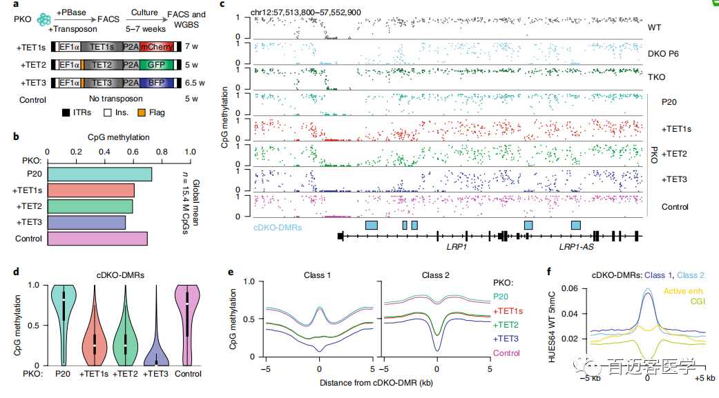 為了驗(yàn)證cDKO-DMR是否依賴并持續(xù)誘導(dǎo)TET活性,利用PiggyBac轉(zhuǎn)座將外源TET1(短isoform簡稱TET1s)、TET2和TET3重新引入PKO細(xì)胞中,并使用WGBS測量了總體甲基化水平(圖2a)。在異位表達(dá)每種蛋白質(zhì)后,PKO細(xì)胞的總體平均甲基化水平從第20代的0.73明顯降低到了異位表達(dá)每種蛋白質(zhì)后的0.61、0.59和0.54,而僅用轉(zhuǎn)座酶轉(zhuǎn)染的對照細(xì)胞保持穩(wěn)定(平均值=0.70;圖2b)。重新引入任何TET酶可在很大程度上恢復(fù)TKO細(xì)胞中異常高甲基化的區(qū)域,誘導(dǎo)快速的cDKO-DMR去甲基化(圖2c-e)。從機(jī)理的角度來看,TET1s亞型缺乏CXXC結(jié)構(gòu)域,無法募集至未甲基化的CpG密集區(qū)域,但TET1和TET2 rescue結(jié)果之間無明顯差異,支持了CXXC結(jié)構(gòu)域無關(guān)的募集機(jī)制。TET及其作用相反的酶在cDKO-DMRs上的持續(xù)動態(tài)也得到了已發(fā)表的染色質(zhì)免疫沉淀的支持,隨后進(jìn)行ChIP-seq,該數(shù)據(jù)表明WT ESC中DNMT3B和TET1均富集,盡管富集在比相當(dāng)狹窄且定義明確的cDKO-DMR邊界更寬區(qū)域。最后,進(jìn)行了全基因組氧化亞硫酸氫鹽測序(oxBS),并在WT細(xì)胞中發(fā)現(xiàn)了5hmC的顯著局部富集(平均cDKO-DMRs,0.07;背景,0.01;圖2f)。