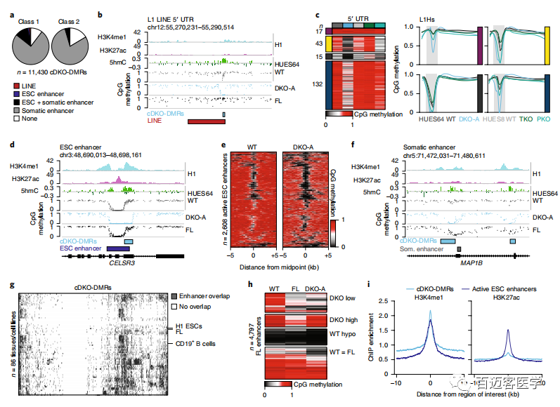 為了探索這種局部調(diào)節(jié)的動態(tài)甲基化的保守性,在小鼠表皮干細(xì)胞(EpiSCs)中突變了Dnmt3a和Dnmt3b,因?yàn)樗鼈兇砹伺c人類多能細(xì)胞最接近的發(fā)育和分子類似物。在第4步對WT和DKO細(xì)胞進(jìn)行了WGBS測序,并鑒定了3888個與人類DKO-DMR具有相似特性的DMR,與82%的推定體細(xì)胞增強(qiáng)子重疊。雖然數(shù)量、√確序列和坐標(biāo)未直接在物種之間map,但小鼠DKO-DMR出現(xiàn)在非常相似的位置且與直系同源基因接近(圖4a)。因此,在體細(xì)胞增強(qiáng)子處甲基化轉(zhuǎn)換的機(jī)制和這些區(qū)域的調(diào)控模式都看起來非常保守。