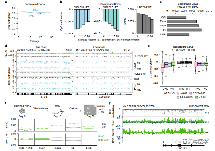 將WT HUES64 ESC分化為有絲分裂后的運(yùn)動神經(jīng)元,其中5hmC不能通過分裂被動稀釋,以更具體地跟蹤TET的參與度和催化活性。培養(yǎng)60天后,基因(特別是表達(dá)的基因)和基因間基因座內(nèi)富集了5hmC水平,其中*大的增加發(fā)生在惰性染色質(zhì)內(nèi),支持了TET的廣泛氧化(圖5f,g)。因此,TET通過運(yùn)動神經(jīng)元以及ESC的基因組保持了廣泛氧化甲基胞嘧啶的能力。