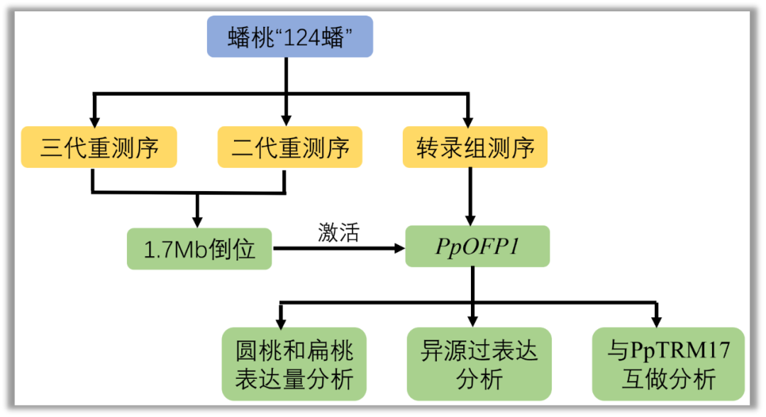 那么同樣是桃子,為什么蟠桃是扁的呢?近日,國(guó)際知名期刊Plant Biotechnology Journal(IF=8.15)在線發(fā)表了中科院武漢植物園韓月彭老師課題組及其合作單位共同的研究成果“1.7-Mb chromosomal inversion downstream of a PpOFP1?gene is responsible for flat fruit?shape in peach”,該研究發(fā)現(xiàn)在蟠桃基因組中存在1個(gè)1.7Mb的倒位,而該變異會(huì)激活其附近的基因PpOFP1表達(dá),導(dǎo)致蟠桃扁平果實(shí)。在該研究中,大片段的結(jié)構(gòu)變異的檢測(cè)是分析的基礎(chǔ),而三代測(cè)序技術(shù)能夠高效地助力大片段倒位的發(fā)現(xiàn)。今天大師兄為大家奉上文章解讀,以饕讀者。