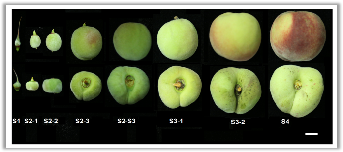 桃起源于250萬(wàn)年前的中國(guó)青藏高原的西南部,在中國(guó)已有4000年的栽培史,其中有一個(gè)獨(dú)特變種—蟠桃,蟠桃果實(shí)呈扁平狀,體積較小,和我們常見的圓形桃子有明顯區(qū)別,雖然長(zhǎng)相一般,不過它具有酸度低、糖含量高等優(yōu)異品質(zhì),受到越來(lái)越多的消費(fèi)者喜愛。蟠桃果實(shí)扁平的特征受6號(hào)染色體上的S位點(diǎn)調(diào)控,同時(shí)S位點(diǎn)與控制鮮重和果實(shí)敗育位點(diǎn)緊密連鎖。關(guān)于S位點(diǎn)的基因定位研究有多次報(bào)道,發(fā)現(xiàn)2個(gè)臨近候選基因(CAD1LRR-RLK)與果實(shí)扁平的性狀共分離,但后續(xù)又有研究顯示這2個(gè)基因并非與CAD1LRR-RLK共分離。所以,對(duì)于扁桃扁平性狀的遺傳基礎(chǔ)研究仍待繼續(xù)。
