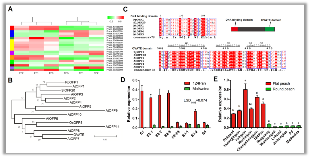 通過比較扁桃和圓桃果實(shí)發(fā)育過程中果實(shí)縱徑和果實(shí)橫徑的變化,發(fā)現(xiàn)在S2時(shí)期兩者果實(shí)增長(zhǎng)均較快(圖2),于是作者在S2時(shí)期選擇多個(gè)扁桃和圓桃進(jìn)行轉(zhuǎn)錄組測(cè)序,結(jié)果在S位點(diǎn)附近發(fā)現(xiàn)1個(gè)在扁桃中上調(diào)差異表達(dá)基因rupe.6G290900PpOFP1)(圖3A)。PpOFP1AtOFP1SlOFP20為同源基因,2個(gè)基因分別負(fù)調(diào)控?cái)M南芥細(xì)胞伸長(zhǎng)以及番茄子房發(fā)育,從而說明PpOFP1很有可能是引起果實(shí)形狀變化的候選基因。在果實(shí)發(fā)育S2期,扁桃果實(shí)中PpOFP1表達(dá)量顯著高于圓桃(圖3D,E),RNA原位雜交也顯示PpOFP1基因在外皮層和內(nèi)皮層細(xì)胞分裂區(qū),該結(jié)果再次證實(shí)PpOFP1在果實(shí)縱向發(fā)育過程中發(fā)揮重要作用。