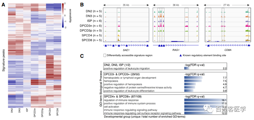 所有特征區(qū)域聚類(lèi)熱圖將7個(gè)T細(xì)胞類(lèi)群按其成熟的順序聚集在一起,突出了T細(xì)胞成熟過(guò)程中染色質(zhì)可及性的持續(xù)變化(圖2A)。連續(xù)發(fā)育階段的逐漸變化導(dǎo)致了DN3和ISP之間的輕度分離,雙陽(yáng)性階段CD3和CD3+(圖2A)導(dǎo)致在使用CIBERSORT反褶積算法預(yù)測(cè)細(xì)胞類(lèi)型預(yù)測(cè)精度不理想。利用主成分1和2的轉(zhuǎn)換,量化了特征OCRs的重要性并發(fā)現(xiàn)SUMO1激活酶亞基1上有一個(gè)峰(圖2B)。此外,OCRs差異可及性附近有階段性特征已知基因如CD8ARAG1/2(圖2B)。雙陽(yáng)性組OCRs在與造血和白細(xì)胞分化相關(guān)的terms富集,單陽(yáng)性組在免疫系統(tǒng)調(diào)節(jié)相關(guān)的terms富集(圖2C)。然而,雙陰性特征峰只富集在一個(gè)GO-term即白細(xì)胞遷移正調(diào)節(jié)(圖2C)。