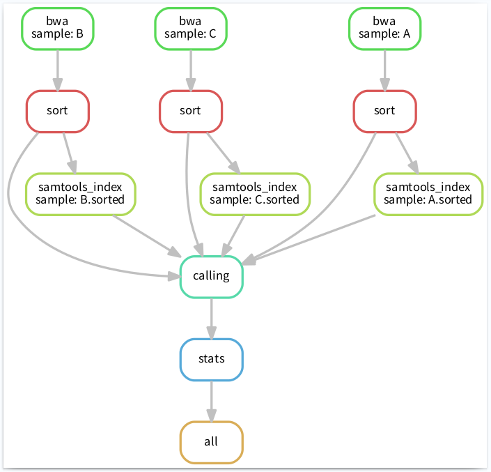這時(shí)候就需要 Snakemake 閃亮登場(chǎng)了,因?yàn)閟nakemake可能是處理這類(lèi)問(wèn)題最簡(jiǎn)單、有效的一個(gè)方法了。比如將流程像下圖這樣搭建起來(lái),清晰明了: