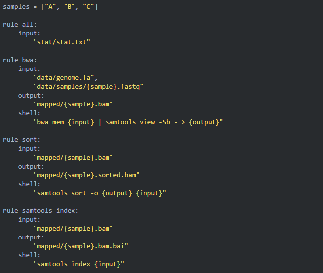 上面的 bwa 規(guī)則僅僅比對(duì)了一個(gè)樣本,可是實(shí)際項(xiàng)目中有幾十上百的樣本時(shí),我們就不能這樣直接寫(xiě)樣本名來(lái)運(yùn)行了,這樣很不 pythonic。snakemake 允許使用通配符(wildcard)來(lái)批量運(yùn)行命令,示例如下: