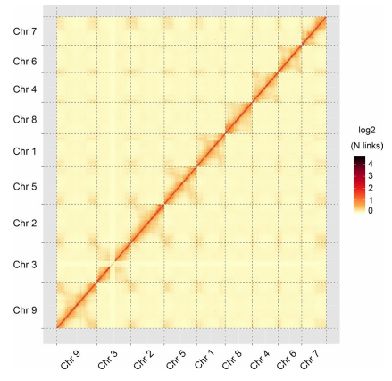 為了便于“小米”作為模型植物的使用,使用PacBio平臺組裝出429.94 Mb基因組 v1.0(k-mer預(yù)估438.26 Mb),contig N50高達18.8?Mb,Scaffold N50為42.41 Mb,并且僅包含48個Gap。其中399.4 Mb通過Hi-C錨定在9條染色體上(掛載率~93%;圖5)。根據(jù)Illumina DNA比對,組裝的錯誤率約為0.001%(每100kb有一個錯誤)。BUSCO評估結(jié)果為97.78%。這些結(jié)果表明“小米”基因組v1.0可以作為研究界的金標準參考。