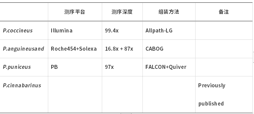 分別對(duì)P.coccineusP.sanguineusandP. puniceus、P.cinnabarinus的基因組進(jìn)行測(cè)序和組裝,四種真菌基因組大小差異不大,編碼基因組的數(shù)量上也比較接近。