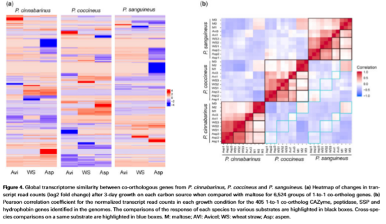 對(duì)Pycnoporus真菌和其他木材降解真菌中的CAZyme基因含量的進(jìn)行比較分析。4種Pycnoporus菌中CAZyme基因數(shù)量非常相似(平均436個(gè)CAZymes,分成108家族),并且和細(xì)胞壁降解相關(guān)的酶與其他真菌相似。說明在白腐菌中碳水化合物活性酶參與的作用模式比較接近。