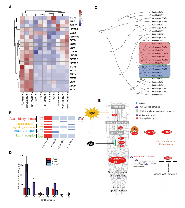 細(xì)葉榕與對(duì)葉榕顯著差異表現(xiàn)為前者有氣生根而后者沒(méi)有,為了尋找觸發(fā)氣生根的途徑,作者在氣生根尖鑒定到811個(gè)高表達(dá)基因。這些高表達(dá)的基因在一系列與運(yùn)輸相關(guān)的生物過(guò)程中顯著富集。通過(guò)對(duì)PIN家族的系統(tǒng)發(fā)育分析,發(fā)現(xiàn)PIN1基因存在顯著的拷貝數(shù)變異(CNV),并確定了兩個(gè)進(jìn)化的PIN1亞群。第一組(PIN1a)在兩種榕樹(shù)和擬南芥中均被鑒定到,第二組(PIN1b)僅于兩種榕樹(shù)中。RNA-seq表明,FmPIN1a在大多數(shù)被測(cè)組織中均有表達(dá),而FmPIN1b1、FmPIN1b2FmPIN1b3在氣生根樣品中高表達(dá)。光受體CRY2和PHR2的拷貝數(shù)增加,TAR(如TAT2a、TAT2b和TAT7b)和YUC編碼基因(如YUC6)的表達(dá)增加進(jìn)一步加速了IAA的積累,與對(duì)葉榕相比,細(xì)葉榕氣生根尖的內(nèi)源生長(zhǎng)素濃度高出5倍。說(shuō)明生長(zhǎng)素的增加引發(fā)了氣生根的發(fā)育,光促進(jìn)的生長(zhǎng)素依賴途徑與氣生根的發(fā)生、生長(zhǎng)和形態(tài)形成有關(guān)。