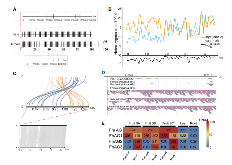 此外,作者新開(kāi)發(fā)了染色體定相方法并重新組裝了X和Y染色體。X染色體和Y染色體中分別為21.9 Mb和22.6 Mb,表明Y染色體已經(jīng)擴(kuò)展了700 kb(圖3C)。比較X和Y染色體,結(jié)合存在或缺失變異(PAV)分析及RNA-seq分析以及重測(cè)序比對(duì),顯示蛋白編碼基因(Fh.12g000020)基因只存在于雄性基因組中,而不存在于雌性基因組中,是影響性別決定的主要因素(圖3E)。