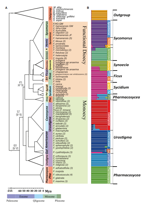 利用112份榕樹(shù)材料的基因組重測(cè)序數(shù)據(jù),建立了榕樹(shù)的系統(tǒng)發(fā)育史,其中包括62種榕樹(shù)屬,包括2個(gè)雌雄同株亞屬(Pharmacosycea, Urostigma)和4個(gè)雌雄異株亞屬(Sycidium,Sycomorus, Synoecia?,Ficus),它們代表了榕樹(shù)的6個(gè)亞屬和主要分支。白肉榕亞屬(Pharmacosycea)被分至兩類,進(jìn)化樹(shù)、ADMIXTURE、遺傳相關(guān)性分析及ABBA-BABA分析發(fā)現(xiàn)了整個(gè)屬存在潛在廣泛的種間雜交。系統(tǒng)發(fā)育揭示了雌雄同株代表了整個(gè)屬的祖先繁殖系統(tǒng)(圖4)。分化時(shí)間顯示,始新世時(shí)期(約47.5 Mya)出現(xiàn)了雌雄同株和雌雄異株的分化。
