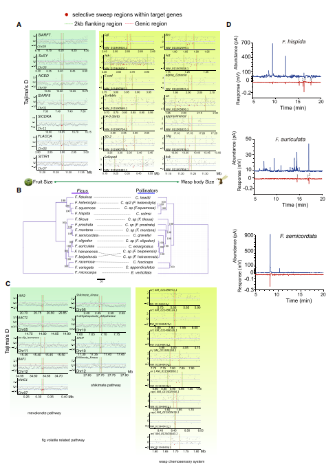 七千五百萬(wàn)年來(lái),榕樹(shù)和榕小蜂之間的專性協(xié)同進(jìn)化在這個(gè)協(xié)同進(jìn)化系統(tǒng)中形成了形態(tài)和生理上的相適應(yīng)。榕樹(shù)在全球和當(dāng)?shù)囟加袠O高的物種多樣性,同域近緣榕果物種間生殖隔離的主要原因是傳粉蜂的特異性。為了探討榕果與傳粉蜂協(xié)同進(jìn)化的潛在分子機(jī)制,作者利用14個(gè)來(lái)自Sycomorus亞屬的榕樹(shù)和其相應(yīng)傳粉蜂的重測(cè)序數(shù)據(jù)進(jìn)行分析。系統(tǒng)發(fā)育分析表明,在這個(gè)分類水平上,寄主關(guān)聯(lián)具有很強(qiáng)的保守性,同時(shí)也檢測(cè)到一些寄主轉(zhuǎn)移事件。為了確定在這些協(xié)同進(jìn)化的物種中可能經(jīng)歷了相互選擇和分化的候選基因,作者利用Tajima’D和SweeD分析對(duì)榕果和傳粉蜂基因組進(jìn)行了選擇性清除分析,顯示在榕果和傳粉蜂中生長(zhǎng)相關(guān)的基因、榕果揮發(fā)物相關(guān)基因和傳粉蜂化學(xué)感應(yīng)系統(tǒng)相關(guān)基因受到一定的選擇作用。并通過(guò)榕小蜂對(duì)三種不同榕果釋放揮發(fā)物質(zhì)的電生理測(cè)試,支持了甲羥戊酸和莽草酸途徑在吸引特定傳粉者方面的重要作用(圖5),揭示了在這種專性互利共生中共分化的潛在分子機(jī)制。