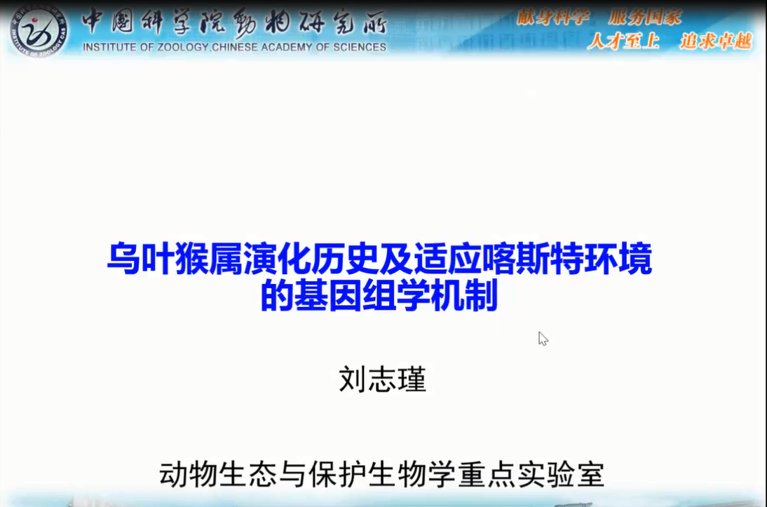 中國(guó)科學(xué)院動(dòng)物研究所劉志瑾副研究員詳述了烏葉猴屬中黑葉猴種組、銀葉猴種組、郁烏葉猴種組三個(gè)種組演化地位和種群動(dòng)態(tài)。并對(duì)石山葉猴和雨林葉猴兩大類(lèi)群以及黑葉猴種組的分化情況進(jìn)行了深入闡述。研究最后推斷EDNRB基因是在自然選擇過(guò)程中,在白頭葉猴遺留下來(lái)的環(huán)境適應(yīng)性毛色表型的關(guān)鍵機(jī)制。劉老師的報(bào)告使相關(guān)領(lǐng)域?qū)W者對(duì)靈長(zhǎng)類(lèi)生態(tài)分類(lèi)群中的基因-環(huán)境相互作用和生理-形態(tài)適應(yīng)機(jī)制有了新的認(rèn)識(shí)。